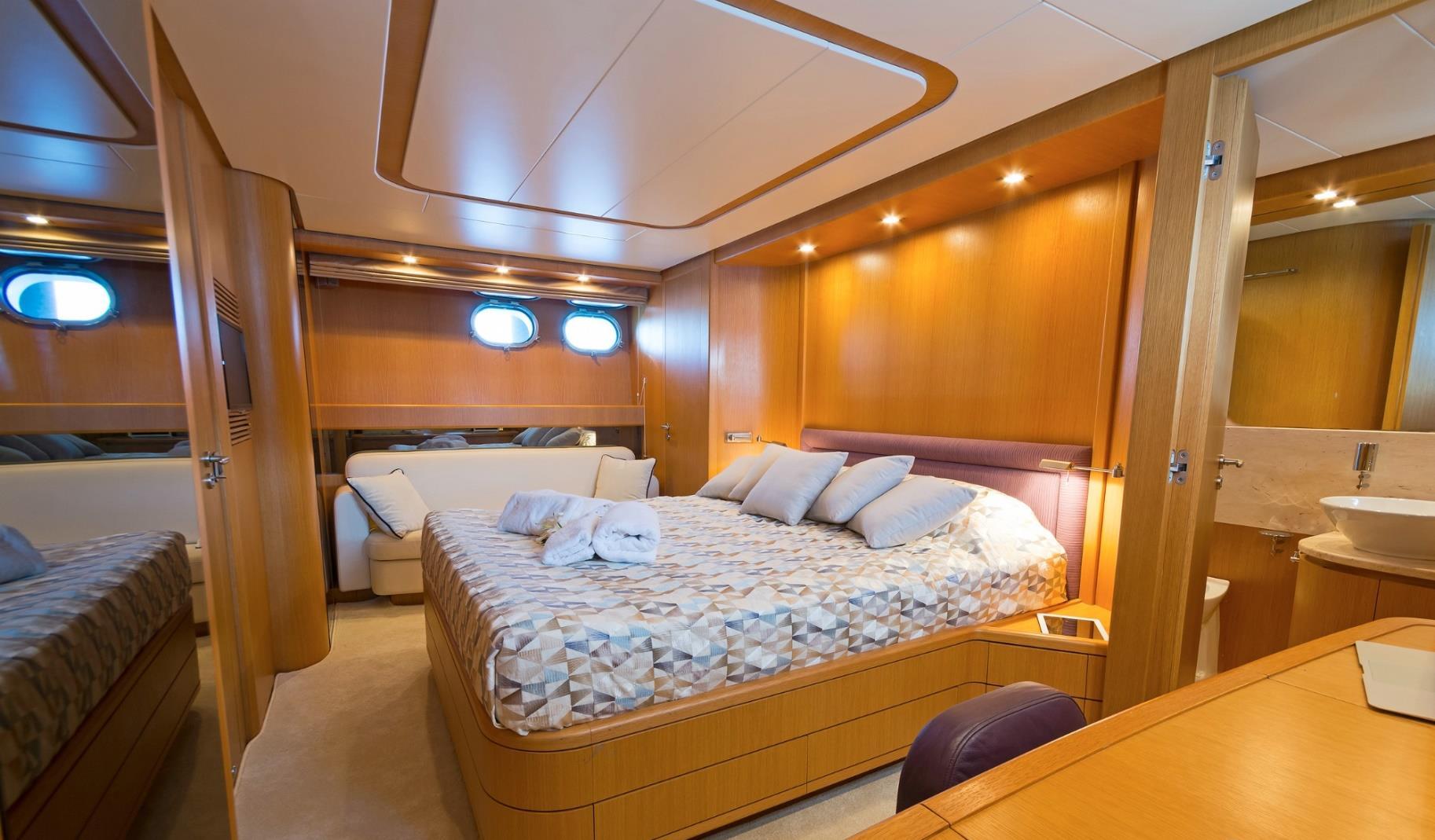 Indulge in luxury aboard the 72ft San Lorenzo yacht from 1StopYachts, crafted in 2009 to provide an exquisite experience on the water. With a capacity of 25 guests for day trips and 8 guests for overnight stays, this yacht features two master cabins and two double cabins, ensuring a comfortable journey. Enjoy the fully equipped kitchen, BBQ, and sound system for an unforgettable voyage with 1StopYachts.